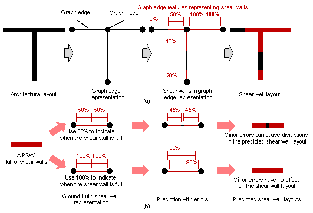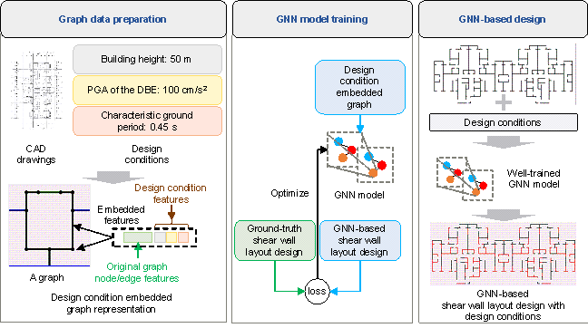 AbstractThe construction industry, traditionally labor-intensive, has now been evolving towards automation and the incorporation of intelligence. Notably, the shear wall layout has been a critical component in structural construction, where neural networks have promoted the emergence of sophisticated design methods. These methods integrate graph neural networks (GNNs), successfully mitigating the computational resource demands and challenges in capturing the topological features, which are the impediments in pixel image-based methods. However, the existing GNN-based methods marginally accommodate structural design conditions and underperform in fulfilling practical engineering requirements. Specifically, these methods overlook influential factors such as the peak ground acceleration (PGA) of the design basis earthquake (DBE), characteristic ground period, and building height, all of which are crucial to the shear wall layout design. To address this research gap, this study proposes an innovative GNN-based design method that duly incorporates design conditions〞including the PGA of the DBE, characteristic ground period, and building height〞and rigorously evaluates its advantages over previous approaches. The findings confirm the efficiency and reliability of the proposed design-condition-informed method and highlight its capability to accurately correlate shear wall layouts with design conditions. Keywordsgraph neural network; design conditions; shear wall structure; intelligent shear wall layout design; deep learning 1. IntroductionReinforced concrete shear wall structures represent a prominent high-rise category requiring diligent architectural and structural design considerations [1-3]. In the design process, the preliminary layout of the structure holds paramount significance [2-5], but its conventional design methods are time-consuming and heavily reliant on the expertise of engineers. In response to these challenges, automated and intelligent design methods have emerged [3, 6-9]. Intelligent design methods based on pixel images for shear wall structural layout [2, 10-14] face significant challenges in accurately representing complex structural forms [3]. Their reliance on high-resolution images leads to sparse critical component features, excessive model parameters, and substantial computing resource demand [3]. In addition, the pixel representation of different architectural and structural elements inadequately encapsulates their topological relationships. This inadequacy obstructs seamless integration with subsequent processes, such as modeling and analysis, often necessitating the development of compensational post-processing algorithms [3, 14-15]. Graph data, including graph nodes and edges, has the natural topological form and the potential to deal with structural problems [16-20]. Unlike the intelligent design methods that rely on pixel images, the graph neural network (GNN) approach utilizes graph data representing the topological features of elements [17, 21] and offers novel solutions for intelligent structural layout design [3, 22-24]. Zhao et al. [3] pioneered the representation of shear wall layouts based on the GNNs. Their results have demonstrated that the GNN-based methods outperform the pixel image-based ones in considering the topological characteristics of building components and the continuity of shear wall layouts. Despite the significant advantages of the GNN-based design method by Zhao et al. [3], certain limitations persist. The current GNN-based design method adopts coarse grouping, dividing the data into categories based on the seismic design intensity and building height for separate training. Consequently, it is challenging to fully account for the correlation between the shear wall layout and seismic design conditions. Crucial design conditions, such as the corresponding peak ground acceleration (PGA) of the design basis earthquake (DBE) with a 10% probability of exceedance in 50 years [25], characteristic ground period, and specific building height, are not adequately considered, resulting in difficulties meeting the design requirements of practical engineering. Liao et al. [13] inspired embedding design conditions into the intelligent structural layout design. However, the research of Liao et al. [13] has several shortcomings: (1) it relies on pixel images, leading to an abundance of model parameters and the inability to consider the topological relationships between the building components [3]. (2) it only considered two types of seismic design intensities in the form of text (※seven§ and ※eight,§ indicating that the corresponding PGAs of the DBE are 100 cm/s2 and 200 cm/s2, respectively) and grouping of three building heights (※H1,§ ※H2,§ and ※H1H2,§ representing heights < 50 m, 50每150 m, and 0每150 m, respectively). The design conditions in discrete groups have significant limitations and cannot fully capture all practical design requirements. For example, a PGA of the DBE of 50 cm/s2 was beyond the scope of Liao et al. [13]*s research. In addition, the design of shear walls could not be accurately guided by a specific height because only rough height groupings were considered. (3) Liao et al. [13] overlooked the characteristic ground period; however, the characteristic ground period frequently collaborates with the PGA of the DBE and natural vibration period of the structure to guide the structural design [26]. To address these deficiencies, this study proposes a design-condition-guided method for shear wall layouts based on the GNNs. By leveraging the powerful topological feature processing capabilities of the GNNs and refining the consideration of three essential design conditions (i.e., the PGA of the DBE, characteristic ground period, and specific building height), this study aims to overcome the abovementioned limitations. This study proposes a GNN-based design method for shear wall layouts that considers the design conditi