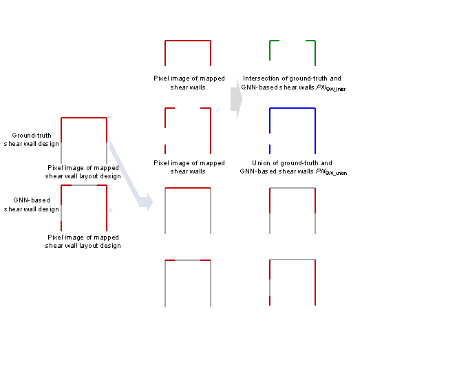 where H represents the building height, Hn represents the normalized building height, and Hmax represents the reference value for normalization, which is taken as 100 m. The design conditions are considered by embedding the normalized an, Tn and Hn into the node and edge features, as listed in Table 1. Considering the graph representation Graph-PSW-PW-DW in Table 1 as an example, the original node and edge features are [xn, yn] and [1, 0, 0, 0, xleft, yleft, xright, yright, length], respectively, and the node and edge features after embedding the design conditions are [xn, yn, an, Tn, Hn] and [1, 0, 0, 0, xleft, yleft, xright, yright, length, an, Tn, Hn], respectively. This study discusses the following four design condition combination scenarios. Notably, the training processes of these four scenarios are identical, with their distinctions arising from the extent, to which they considered the design conditions. GNN-DC-0: Design conditions are not considered. GNN-DC-1: Only the design condition of structure height is considered. GNN-DC-2: Two design conditions of the structural height and PGA of the DBE are considered. GNN-DC-3: All three design conditions (the PGA of the DBE, characteristic ground period, and building height) are considered. 3.3. GNN Model and DatasetZhao et al. [3] thoroughly examined various GNN model architectures suitable for the graph edge representation method and ultimately identified the GNN-EP-4 model as the top-performing option. Therefore, the GNN-EP-4 model proposed by Zhao et al. [3] is used as the fundamental neural network architecture, as shown in Figure 5. The meanings of the parameters within the neural network architecture shown in Figure 5 align with those outlined in Table 3 by Zhao et al. [3]. Furthermore, the arrangement of the shear walls in the structure is independent of the angle and position of the structure in the drawing. Therefore, a data augmentation method consistent with the research by Zhao et al. [3], which considers the rigid-body translation, flipping, and rotation of the shear wall structure, was adopted in this study. Specifically, the upside-down flipping (two cases), counterclockwise rotation with a modulus of 90∼ (four cases), up or down translation with a modulus of 2 m and a range of 0每20 m (21 cases), and left or right translation with a modulus of 2 m and a range of 0每20 m (21 cases) are included in the data augmentation method, which is theoretically equivalent to expanding the data amount by 3528 times (2 ℅ 4 ℅ 21 ℅ 21 = 3528) [3]. The data augmentation method is embedded in the training process of the neural network. During each iteration of the neural-network training process, each data is randomly subjected to the above four transformations to achieve data augmentation. The engineering goal of this study is to design shear wall layouts, which is consistent with that of the research by Zhao et al. [3]. Therefore, the L1 loss function (mean absolute error) [27] from Equation (3) by Zhao et al. [3] is adopted as the loss function for the neural network in this study. Appendix A compares the effects of three commonly used loss functions, and also shows that the L1 loss function is optimal. The datasets of shear wall structures used in this study are collected from several well-known architectural design institutes in China, and all the designs are executed by experienced engineers. For this study, we employ the dataset from the study by Zhao et al. [3] as the foundation, supplemented with new additions. This study divides 338 shear wall structure data into a test set (comprising 50 data) and a training set (comprising 288 data). Among the test set, 30 data are identical to the 30 data in the test set by Zhao et al. [3], which belong to three different design groups. Retaining the same data in the test set allows for a convenient comparison between the shear wall layout design results obtained using the method proposed in this study and those derived from the method proposed by Zhao et al. [3]. Figure 5 GNN model [3]: 4. Discussion4.1. Evaluation MethodLiao et al. [2], Zhao et al. [3, 14, 28], and Fei et al. [15] showed that an intersection over union (IoU)-based indicator can better judge the similarity between the shear wall layout designed using the deep learning method and that designed by engineers. However, when it is necessary to comprehensively evaluate the influence of different PGAs of the DBE, characteristic ground periods, and building heights on the mechanical and economic characteristics of the shear wall design results, it is not sufficient to consider only the similarity based on the IoU. The IoU metric focuses on the similarity of the spatial distribution of the engineer-designed and neural-network-designed shear wall layouts. The shear wall ratio (i.e., the ratio of shear walls to total walls) is a critical indicator that reflects the mechanical and economic characteristics of the shear wall design results. Liao et al. [13] showed that the similarity evaluation index of shear wall layout considering the shear wall ratio can better evaluate the comprehensive performance of the structure and reflect the impact of different design conditions on the shear wall layout. Therefore, this study proposes a comprehensive evaluation index ScoreDC that considers the similarity of the spatial distribution of the shear wall layout and the similarity of the shear wall ratio, as shown in Equations (4)每(12). The schematic diagram of ScoreDC is shown in Figure 6. The evaluation index ScoreDC used in this study is a comprehensive evaluation of the similarity of the shear wall layout and the similarity of the shear wall ratio. For the design results of the shear wall layout, the similarity of the shear wall layout and the similarity of the shear wall ratio are both important, so an index that combines the two similarities is necessary. ScoreDC is composed of two parts: the shear wall layout similarity index IoUSW