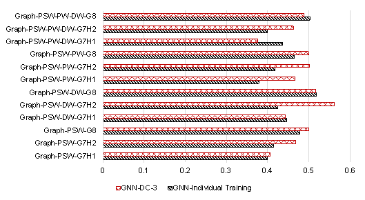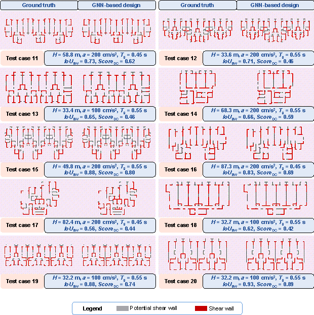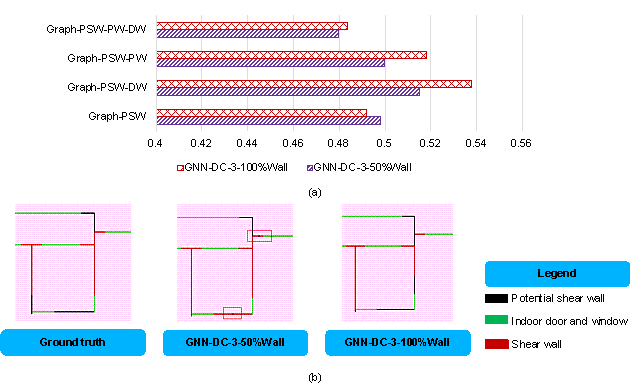 where ScoreDC is the comprehensive evaluation index; IoUSW is the IoU of the shear wall layout designed by the GNN model and that designed by engineers, which is calculated by projecting the design results on a pixel image with spatial resolution of 10 mm/pix, and the calculation method is consistent with that shown in Figure 6 in the study by Zhao et al. [3]; w1 and w2 are, respectively, the weight coefficients of the shear wall ratio in two orthogonal directions; swgt1 and swgt2 are, respectively, the shear wall ratios in the two orthogonal directions of the engineer*s design results; swpre1 and swpre2 are, respectively, the shear wall ratios in the two orthogonal directions of the GNN model*s design results; PNsw_gt1 and PNsw_gt2 are, respectively, the pixel number of the shear walls in the two orthogonal directions of the engineer*s design result; PNsw_pre1 and PNsw_pre2 are, respectively, the pixel number of the shear walls in the two orthogonal directions of the GNN model*s design result; PNwall is the pixel number of the PSW in the shear wall structure; PNSW_inter and PNSW_union are the intersection and union of the engineer-designed and GNN-designed shear wall layouts, respectively; and PNSW_gt and PNSW_GNN are the shear wall pixel numbers of the engineer-designed and GNN-designed shear wall layouts, respectively. Figure 6 Schematic diagram of ScoreDC. 4.2. Evaluation of Test Set4.2.1. Evaluation Results of Different Design Condition Combination ScenariosFigure 7 displays the average ScoreDC of the test set for the four design condition combination scenarios (GNN-DC-0, GNN-DC-1, GNN-DC-2, and GNN-DC-3) and four graph edge representation methods (Graph-PSW, Graph-PSW-DW, Graph-PSW-PW, and Graph-PSW-PW-DW). As evident from Figure 7, for all the graph edge representation methods, GNN-DC-3 exhibits the best performance, whereas GNN-DC-0 fares the poorest. GNN-DC-0, GNN-DC-1, GNN-DC-2, and GNN-DC-3 exhibit a trend of progressive performance improvements. This trend indicates that the adequacy of the design conditions positively influences the ability of the GNN-based design method to capture the performance of the shear wall layout. In addition, the Graph-PSW-DW graph edge representation method has the best overall effect, consistent with the findings by Zhao et al. [3]. Figure 7 ScoreDC for different design condition combination scenarios. 4.2.2. Comparison with Individual Training by Design Condition GroupIn Section 3.3, it is mentioned that the 30 data in the test set of this study are consistent with those used by Zhao et al. [3]. In Zhao et al. [3]*s study, the structural data with different seismic design intensities were pre-divided into three groups, namely G7H1, G7H2, and G8, and trained in separate groups. G7H1 and G7H2 indicate that the seismic design intensity is 7∼, and the PGA of the DBE is 100 cm/s2. G7H1 and G7H2 correspond to structure heights ≒ 50 m and > 50 m, respectively. G8 indicates that the seismic design intensity is 8∼, and the PGA of the DBE is 200 cm/s2. Unlike the group training approach in the study by Zhao et al. [3], this study trains all the shear wall data with different design conditions, considering the design condition as one of the data features. Figure 8 shows the difference in the average ScoreDC of the 30 test set data when comparing the proposed method with that of Zhao et al. [3]. For comparison, the design condition combination scenario GNN-DC-3 is used in this study, and GNN-Individual Training presents the training method used by Zhao et al. [3]. As shown in Figure 8, in most cases, the ScoreDC of the condition-informed design method proposed in this study is either better than or at par with the grouped training method used by Zhao et al. [3]. Zhao et al. [3] divided the data into G7H1, G7H2, and G8 groups. However, pre-grouping the data according to the design conditions often leads to a coarse grouping basis. Rough grouping limits the design conditions of the shear wall structure that the neural network can handle to the group categories, which may not align with the relatively flexible combinations of the design conditions required in practical design scenarios. Moreover, pre-grouping divides the data into several groups, reducing the amount available for individual training and thus impacting the neural network*s generalization ability. In contrast, the proposed design-condition-informed method for the shear wall layout design overcomes these limitations. Only one well-trained model is required to design the shear wall layout for any combination of design conditions. As a result, the proposed design method outperforms the pre-grouped training method in terms of convenience and flexibility when handling the various design condition combinations. Figure 8 Differences in ScoreDC between this study and Zhao et al. [3]*s study on G7H1, G7H2, and G8 design groups. 4.2.3. Difference in Shear Wall Layouts Between Two Shear Wall Representation MethodsAs depicted in Section 3.1 and Figure 3, a difference exists in the representation of the shear walls in the graph compared to that by Zhao et al. [3]. When a PSW is covered with shear walls, this study uses ※100 %§ as the proportion of shear walls at both ends of the PSW edge to represent the shear wall, while Zhao et al. [3] used ※50 %§. Figure 9a shows the ScoreDC difference between the two shear wall representation methods under the design condition combination scenario GNN-DC-3, where GNN-DC-3-100%Wall uses ※100 %§ as the shear wall proportion at both ends of the PSW edge to represent the shear wall when a PSW is covered with shear walls, and GNN-DC-3-50%Wall uses ※50 %§, which is same as the shear wall representation method by Zhao et al. [3]. It can be observed from Figure 9a that the proposed feature-representation method of shear walls exhibits a slightly better performance on ScoreDC than the feature-representation method by Zhao et al. [3]. Figure 9b shows an example f