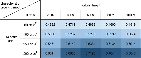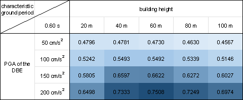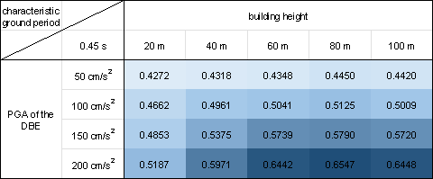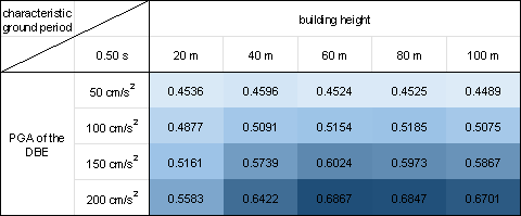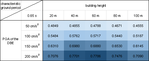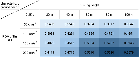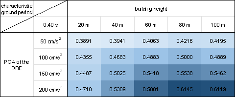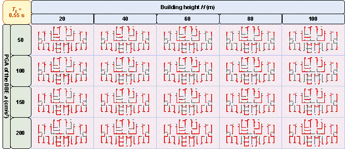 where PNsw is the pixel number of the shear wall of the GNN-designed shear wall layout and PNwall is the pixel number of the PSWs in the shear wall structure. Figure 10 demonstrates that the proposed design-condition-informed method enables a better understanding of the shear wall layout variations with respect to the design conditions. Specifically, under identical building heights and characteristic ground periods, the shear wall ratio tends to increase with an increase in the PGA values of the DBE. The PGA of the DBE directly influences the maximum value of the spectral acceleration during the shear wall structure design, consequently impacting the lateral load of the seismic design. Because the shear wall plays a vital role in resisting the lateral forces in a shear wall structure, an increase in the lateral load during seismic design results in more shear walls. Under a constant PGA of the DBE, the shear wall ratio exhibits an initial increase, followed by a slight decrease with an increase in the building height. According to the Chinese code for seismic design of buildings [26], when the structural natural vibration period is greater than the characteristic ground period Tg, the spectral acceleration of the seismic design response spectrum gradually decreases, as shown in Figure 4. For the same architectural layout, an increase in height often corresponds to a longer natural vibration period. For lower structural heights, the period is smaller, and height increment results in an increased vertical load. Consequently, as the height increases, the shear wall ratio generally increases to withstand the vertical gravity load. However, when the structure is high, the horizontal load becomes the control load for the shear walls. A longer natural vibration period reduces the spectral acceleration of the seismic design response spectrum, thereby reducing the lateral seismic force. Consequently, the shear wall ratio decreases with a decrease in spectral acceleration. As the characteristic ground period increases, the shear wall ratio increases. As the characteristic ground period increases, the corresponding period value (the characteristic ground period Tg at which the spectral acceleration value in the seismic design response spectrum decreases) increases, as shown in Figure 4. In scenes with longer characteristic ground periods, structures with the same natural vibration period are more likely to experience higher spectral acceleration than those with smaller characteristic ground periods. Consequently, when the characteristic ground period is extended, engineers tend to arrange more shear walls to enhance the seismic resistance. (a) (b) (c) (d) (e) (f) (g) (h) Figure 10 Shear wall ratios under various combinations of design conditions with characteristic ground periods of (a) 0.30 s, (b) 0.35 s, (c) 0.40 s, (d) 0.45 s, (e) 0.50 s, (f) 0.55 s, (g) 0.60 s, and (h) 0.65 s. Figure 11 shows the GNN-based shear wall layouts under various combinations of design conditions corresponding to Figures 10c and 10d with specific cases. The results of shear wall layouts corresponding to the remaining cases in Figure 10 (Figures 10a-10b and Figures 10e-10h) are supplemented in Figure B.1 in Appendix B. (a) (b) Figure 11 Shear wall layouts of one case under