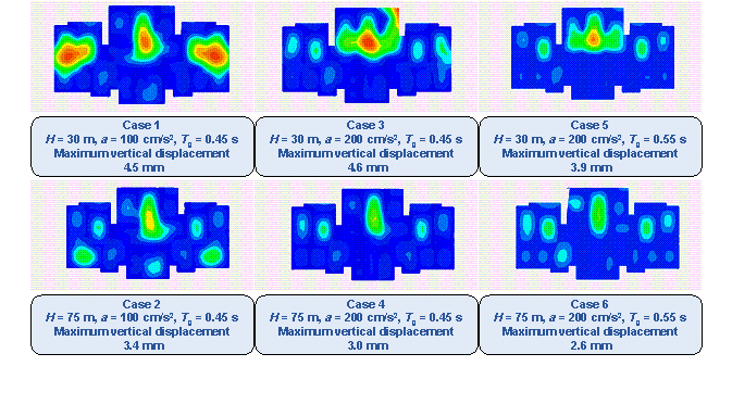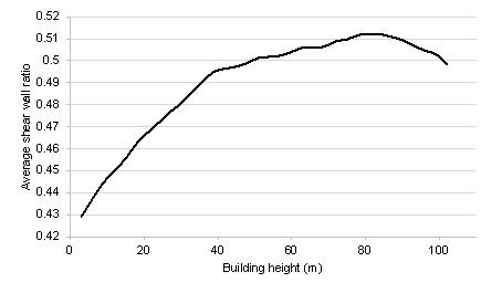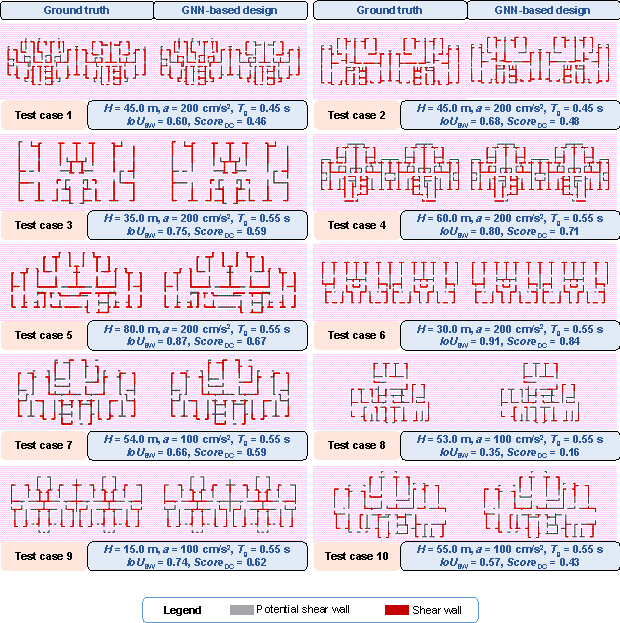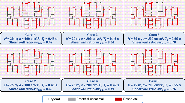 various combinations of design conditions corresponding to Furthermore, Figure 12, taking 3 m as the change step of structure height, shows the influence of small changes in structure height on the average shear wall ratios of all test-set results under the scenario of the PGA of the DBE of 100 cm/s2 and the characteristic ground period of 0.45 s. In the case where the PGA of the DBE is 100 cm/s2 and the characteristic ground period is 0.45 s, the shear wall ratio increases with the increase of building height when the building height is less than 80 m, and the shear wall ratio decreases with the increase of building height when the building height is greater than 80 m. This trend is consistent with that shown in Figure 10d. Figures 10-12 and B.1 show that the shear wall layout designed by the proposed GNN-based method is highly related to the design conditions, and the quantitative characteristics of the shear wall layout can change sensitively with the design conditions. Figure 12 Variation of the average shear wall ratios of all test-set results with the structure height under the scenario of the PGA of the DBE of 100 cm/s2 and the characteristic ground period of 0.45 s. 4.2.5. Design Results of Test-Set CasesFigure 13 shows the design results of shear wall layouts for 10 cases in the test set, and the remaining 40 test-set cases are shown in Figure C.1 in Appendix C. It can be seen from Figure 13 and Figure C.1 that the test set includes a variety of architectural layouts and design condition combinations, and the proposed method in this study can better capture the shear wall layouts. Therefore, the proposed method is general to various architectural layouts and design condition combinations. Figure 13 Design results of test cases 1每10. 5. Case StudiesUsing a test case as an illustration, Figure 14 presents the shear wall layout design results for the same architectural configuration under different design conditions and the corresponding shear wall ratio (swtotal) values. For convenience, only the shear walls and PSWs are shown in Figure 14, wherein the number of shear walls in the layout exhibits substantial variations under different design conditions. Moreover, the variation pattern of the shear wall ratio swtotal is consistent with that shown in Figure 10. Figure 14 Shear wall layouts of one case under different design conditions. The method proposed by Zhao et al. [28] is used to arrange the beam and slab of the shear wall structure, followed by mechanical analysis and preliminary design. The floor height is 3 m. Subsequently, this study analyses the inter-story drift ratios of the cases depicted in Figure 14 under earthquake action, as illustrated in Figure 15. Figure 16 shows the vertical displacements of the typical floor slabs of the cases under gravity load. Table 2 presents the natural vibration periods, torsional period ratio (the ratio of the first torsional natural vibration period and the first translational natural vibration period), maximum inter-story drift ratios, total masses, and concrete and steel material consumptions. Figure 15, Figure 16, and Table 2 show that the structural properties are highly related to the shear wall layout. Notably, all the design results exhibit maximum inter-story drift ratios below the design limit of 0.001 [26], thus fulfilling the design requirements of the specifications. The torsional period ratio is an important index to control the torsional effect of the structure, and Table 2 shows that the torsional period ratios of the cases are below the design limit of 0.9 [26, 29]. It can be observed from Cases 1, 3, and 5 presented in Table 2 that an increase in the shear wall ratio leads to increased total mass and material consumption, accompanied by a reduction in the natural vibration period. The same conclusion can be drawn from Cases 2, 4, and 6 presented in Table 2. Figure 15 Inter-story drift ratios of cases under different design conditions. Figure 16 Vertical typical-floor-slab displacement cloud diagrams of cases under different design conditions. Table 2 Some structural characteristics of cases under different design conditions