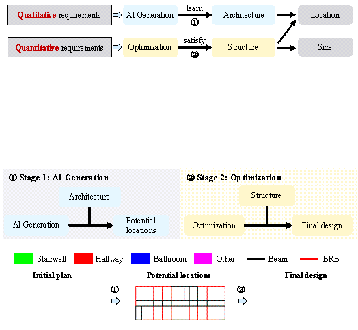 1 Introduction In recent years, rapid urbanization and the increasing service life of buildings have brought safety and seismic performance to the forefront of engineering concerns. This issue is especially urgent in earthquake-prone regions, where improving the seismic resilience of structures poses significant challenges. In response, many regions have progressively raised their seismic fortification requirements to ensure adequate seismic capacity. Therefore, many aging buildings struggle to meet current structural stiffness standards, necessitating urgent retrofitting. One of the most commonly used retrofit methods is the installation of buckling-restrained braces (BRBs). 1,2 This method not only enhances the stiffness and load-bearing capacity of structures but also provides excellent energy dissipation and damping performance, effectively reducing seismic responses and ensuring compliance with modern codes. 3¨C5 Reinforced concrete (RC) frame structures are widely used in residential and industrial buildings. However, many aging RC frame structures worldwide do not comply with the latest seismic design codes, necessitating seismic retrofitting. For certain aging buildings with insufficient lateral stiffness, alterations to the original layout must be minimized while ensuring the feasibility, effectiveness, and cost-efficiency of the retrofit scheme. BRBs offer a practical solution, as they significantly improve the overall seismic performance without altering the original structural layout. 6 However, designing retrofit schemes often requires multiple iterations of calculation and verification, 7¨C9 making the process complex and reliant on engineers' experience. While several studies have explored structural optimization methods to enhance the efficiency of BRB retrofit designs, 10¨C12 the numerous design variables, constraints, and objectives often limit these methods to simple frameworks and make them time-consuming. Therefore, an intelligent design for seismic retrofitting requires improvements in both quality and efficiency. Determining the locations, configurations, and sizes of BRBs is essential during the comprehensive design of a BRB retrofit scheme. Subsequent designs must also address the detailing of connections between the BRB and the original structure, although this aspect is typically overlooked during the conceptual design phase. A BRB generally comprises a yielding steel core, an outer restraining sleeve, and an unbonded isolation material between them. 13 The steel core serves as the primary load-bearing component, providing lateral stiffness to the structure, whereas the outer restraining sleeve confines the core and matches its size. In structural calculations, stiffness and load-bearing capacity are generally evaluated based solely on the steel core. 14 Thus, when retrofitting RC frame structures using BRBs, the primary challenge involves determining both the specific locations of BRBs and equivalent cross-sectional sizes of the steel cores. These two factors are interdependent and collectively define the lateral stiffness and mechanical performance of the structure, requiring iterative calculations and adjustments for optimization. Once the preliminary design of the BRB retrofit scheme is completed, the subsequent sizes of sleeves, detailed steel core sizes, and connection methods between the BRBs and the original structure can be finalized using established design methods. Therefore, this study focuses on determining the locations of BRBs and the equivalent cross-sectional sizes of the steel cores during the preliminary design phase (thereafter, BRB sizes refer to the equivalent cross-sectional sizes of the steel cores). Section 2 reviews several advanced methods for designing BRB retrofit schemes and related structural solutions. The generative artificial intelligence (AI) design method can rapidly generate structural schemes through data learning; however, often struggles to ensure the rationality of the design outcomes. Conversely, optimization methods can produce more reasonable design schemes, though they tend to be time-consuming and inefficient. By combining generative AI with optimization algorithms, it is possible to leverage the strengths of both approaches, addressing the challenges of improving both the efficiency and quality of BRB retrofit design. This study proposes a two-stage intelligent design method for retrofitting RC frame structures with BRBs, aimed at determining the optimal locations and sizes of BRBs in retrofit schemes. In Stage 1, a generative AI algorithm identifies potential BRB locations based on existing architectural features. In Stage 2, an optimization algorithm determines the specific locations and sizes of BRBs, factoring in mechanical performance requirements. This approach achieves a preliminary design that balances both efficiency and quality in BRB retrofit schemes. Section 2 presents an in-depth review and analysis of the relevant literature. Section 3 introduces the two-stage intelligent design methodology in detail. Sections 4 and 5 elaborate on the intelligent generative approach used in Stage 1 and the intelligent optimization approach in Stage 2, respectively. Section 6 evaluates the effectiveness of the proposed method through case studies, and finally, Section 7 summarizes the research outcomes and suggests directions for future work. 2 Related work 2.1 Generative AI design Generative AI can efficiently learn design data and generate novel schemes, and it has already been used in preliminary structural design projects. Liao et al. 15 pioneered the use of a generative adversarial network (GAN) based on the pix2pixHD model 16 to achieve pixel-to-pixel conversion, enabling the intelligent generation of shear wall layout schemes by learning from existing design drawings. This approach was later enhanced by incorporating design constraints 17 and physical mechanisms 18 to improve design outcomes. Similarly, for s