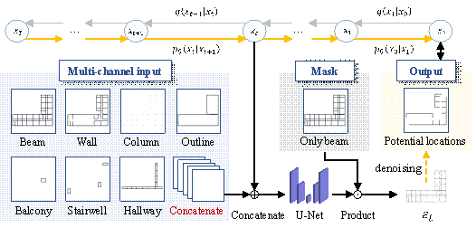 Figure 2. Example of data annotation for generating potential BRB locations in Stage 1. An example of processing a specific case is illustrated in Figure 2. The dataset was divided into a training set and a test set, with the training set containing 111 drawings and the test set containing 11 drawings. 4.2 Method Given the diffusion model¡¯s capacity for producing more detailed generative outcomes, 24 this study used the diffusion model to learn data related to potential BRB locations. This method further optimized the representation of data features, enhancing the accuracy of architectural information and controlling the generation process. The specific procedure is illustrated in Figure 3. Figure 3. Process of using the diffusion model to learn potential BRB locations. To ensure that the feature encoding of each component maintains the