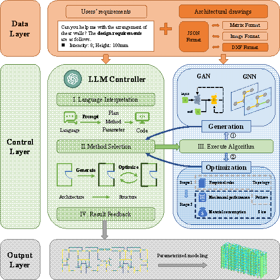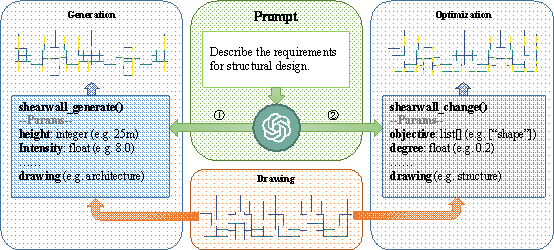 7 Conclusion This paper proposes an intelligent design system for shear wall structures based on LLMs and generative AI. By incorporating simple interactions, an efficient structural design is achieved, and the automation and convenience of the shear wall design process are significantly enhanced. The system utilizes an LLM as the core controller, which translates the design and optimization requirements expressed in natural language into computer-executable code. It manipulates generative AI algorithms to generate the initial layout, and controls the optimization objectives to further adjust the structure details. Through iterative interactions, the final results are obtained, providing valuable references for future development of generic intelligent design systems. Major conclusions are as follows: (1) The proposed intelligent design system for shear wall structures based on LLMs and generative AI integrates structural generation and optimization methods. The LLM serves as the core of interactive control, enabling the automated completion of the entire structural design process in an interactive fashion. This approach not only ensures safety and cost-effectiveness of a design outcome, but also improves the design efficiency by approximately 30 times. (2) In this study, a two-stage optimization method based on empirical rules, mechanical performance, and material consumption was proposed for the entire process of AI intelligent generation and optimization. This method significantly reduces the material consumption while ensuring that the structure meets the mechanical constraints, thereby improving the optimization efficiency. (3) A reasonable and domain-knowledge-inclusive prompt was designed for the LLM in the field of structural design. The effective implementation of the LLM method based on natural language dialogue for controlling the structural design significantly reduces the difficulty sof using the proposed intelligent design system. In the future, it will be possible to utilize advanced pretraining LLM techniques to achieve a profound comprehension and application of knowledge in the field of structural design. Furthermore, there is potential to introduce an additional agent to review the methods invoked by the LLM controller and the generated outcomes, thereby simulating the design review process in practical settings and enhancing the accuracy of the final design. CRediT authorship contribution statement Sizhong Qin: Conceptualization, Methodology, Software, Validation, Visualization, Writing 每 original draft, Writing 每 review & editing. Hong Guan: Resources, Supervision, Writing 每 review & editing. Wenjie Liao: Conceptualization, Funding acquisition, Resources, Supervision, Writing 每 original draft, Writing 每 review & editing, Yi Gu: Data curation, Software, Validation, Visualization. Zhe Zheng: Formal analysis, Software, Validation, Writing 每 original draft. Hongjing Xue: Data curation, Investigation, Resources. Xinzheng Lu: Conceptualization, Funding acquisition, Resources, Supervision, Writing 每 review & editing Declaration of Competing Interest The authors declare that they have no known competing financial interests or personal relationships that could have appeared to influence the work reported in this paper. Acknowledgment Appendix A Owing to the incorporation of various functionalities such as information storage, structural generation, structural optimization, and structural visualization, the development of each functionality relies heavily on the representation format of the data. To align the data format with its corresponding functionality, we constructed four distinct formats to express the structural information. These formats are applied to different functional scenarios, and the conversion relationships among the four formats are shown in Figure A.1. Figure A.1. Four different formats of expressing structural information (coor refers to coordinate). The JSON-format data are stored in the database as the benchmark data format, allowing for bidirectional conversion to other formats. JSON stores the coordinates and layer properties of structural components, boundary coordinates of structural drawings, and base-point coordinates, enabling the representation of the vast majority of architectural and structural drawings. By adopting this approach, which provides an accurate coordinate expression and easy storage management, the use of JSON as the benchmark data format ensures data accuracy and minimizes redundancy in the database. A widely used approach for structural generation is to utilize a GAN [2] . This method requires input files in the image format for generation, and the generated results are also presented in the image format. This study implemented a bidirectional conversion process between image and JSON formats using the OpenCV library and relevant methods in computer graphics, facilitating subsequent design and optimization tasks. Detailed parametric modeling method in structural optimization is given in Section 5.1. Two distinct approaches have been implemented in the domain of structural visualization to cater to diverse user requirements. The adoption of the DXF file format allows for editing and adjustments within professional drawing software such as AutoCAD. In addition, web-based interactive visualization can be achieved by utilizing the ezdxf library. Appendix B A reference prompt for the LLM is provided below, which currently includes only a selection of functions. You are a Civil Engineer. The available information regarding the building layout provides a foundation for the design of the structure. ### Goals: 1. Parse the input to understand users' requirements. 2. Choose proper commands to generate or optimize the shear wall layout. 3. Give some suggestions to make the shear wall layout better. ### Constraints: 1. Exclusively use the commands listed in double quotes e.g. "command name". 2. User will talk with you in any la