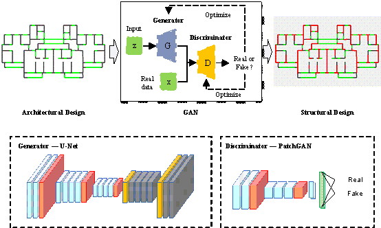 * The shear wall rate refers to the ratio of the shear wall area to the total floor area. 4 Generation: generative AI-based design When designing a structure using an LLM controller, the first step involves obtaining an architectural layout plan from the user as a reference. Based on the user input, the initial design of the structural scheme must be performed, which requires the utilization of a structural generation algorithm. Currently, several techniques are available for generating shear wall structure schemes, primarily employing methods such as GANs and GNNs [31] . Liao et al. [2] employed a GAN to achieve the intelligent generation of structural schemes by learning from existing design drawings. Approximately 250 pairs of architectural-structural designs from over ten renowned architectural design and research institutes in China were adopted in this study. The drawings were firstly converted into image format, and pix2pixHD model [32] was used for training. The generator employs a U-Net architecture to generate shear wall layouts from random noise, while the discriminator uses a PatchGAN architecture to assess the similarity between the model generated design and that obtained from design engineers, thus achieving image-to-image generation of shear wall layouts. The framework of this approach is illustrated in Figure 4. Figure 4. Method for intelligent design of shear walls based on GAN Owing to the challenge of representing the relationships between structural components using images in a GAN, Zhao et al. [7,9] introduced a graph edge representation approach for shear wall structures utilizing a GNN with robust capabilities for extracting topological features. In their study, shear wall structure design was successfully accomplished by predicting the attributes of edges. Through a comparative analysis of various feature selections, the study has demonstrated that the design outcomes closely resembled those designed by experienced engineers. The specific implementation method is illustrated in Figure 5. Figure 5. Method for intelligent design of shear walls based on GNN. Both the GAN and GNN methods demonstrate some advantages. GAN methods exhibit relatively better robustness, whereas GNN methods often yield superior design effects in terms of detail. Qin et al. [33] compared the differences among various algorithms in practical applications. Engineers can select the most appropriate generative method based on the specific requirements and application scenarios. Table 3 provides a detailed comparison of the GAN and GNN methods. Table 3. Comparison of shear wall layout generation by GAN and GNN