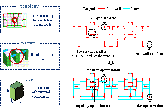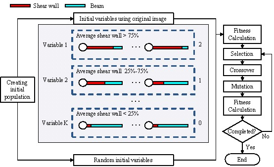 node每edge combinations. Let The closest initial variable representation to the original image can be obtained using this method. A subset of the initial population is selected as the initial variable value to enhance the efficiency of the optimization process. The specific operational process of the genetic algorithm is shown in Figure 10. Figure 10. Flowchart of the genetic algorithm in ※topology + pattern§ optimization 5.3 Stage 2: ※pattern + size§ optimization based on mechanical performance and material consumption After determining the topological layout of the structure, ※pattern + size§ optimization can be implemented. (1) Optimization Variables The optimization variables include the beam height, beam width (which is usually equal to the wall width), and wall length. Because of the excessive computational cost of individually optimizing the dimensions of each component, this section provides simplified approaches for selecting certain variables based on design experience. The specific variable choices are shown in Figure 11. Figure 11. Variable selection in Stage 2. The frame beam height, coupling beam height, and beam width are merged separately and represented by individual variables. However, because of the significant differences in the wall group characteristics, it is challenging to reflect the change in the shear wall length with a single variable. To address this issue, the k-means algorithm is employed to classify wall groups and reduce the number of variables. The specific feature extraction process is presented in Table 5, which encompasses essential information such as wall shape and position, enabling the effective differentiation of wall groups. Table 5. Feature extraction of shear wall groups.