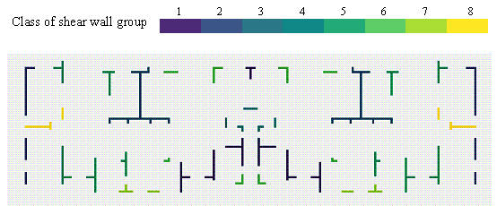 Figure 14. Optimization curve for Stage 1. (2) Stage 2 First, the shear wall groups were clustered using the k-means algorithm. To prevent optimization difficulties due to the large number of variables, the value of K in the k-means algorithm should not be excessively large. In this case, we selected K = 8 for Stage 2 optimization. The clustering results for the shear wall groups are presented in Figure 15. Note that the shear wall groups were divided into 8 classes based on their shapes, lengths, and locations. Figure 15. Results of shear wall clustering based on k-means algorithm. The ranges and steps of each optimization variable are presented in Table 7, based on the optimization variables selected in Stage 2 of Section 5.3. Table 7. Range of optimization variable values.