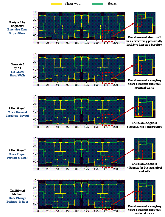 Figure 16. Comparison of structural schemes by different design scenarios. The results indicate that in Stage 1, significant optimization in the layout pattern of the shear walls was performed, resulting in an increase in the number of L-shaped and T-shaped walls and a preliminary reduction in material consumption. Further, Stage 2 optimization focused on specific dimensions, leading to a further decrease in material consumption. Compared to the traditional direct optimization method, both the empirical and the mechanical performance每material consumption evaluation methods showed notable improvements. The total material cost was reduced by 45.88 k CNY compared to the traditional method. Additionally, the empirical evaluation and mechanical performance results were similar to those obtained by design engineers, whereas the overall material cost decreased by approximately 47.04 k CNY. Finally, a time comparison was made on typical design scenarios. Based on the research conducted by senior engineers from several top design institutes in China [51] , the design process for a shear wall structure with an approximate floor area of 500 m2 requires approximately 20 h for preliminary design and 10 h for structural modeling. Furthermore, a significant amount of time is often spent on subsequent adjustments and optimization after the preliminary design. In contrast, the total time required by the proposed intelligent design system was about 1 h, resulting in an efficiency improvement of approximately 30 times. The time required for completing this design case are compared in Table 11. Moreover, the system can be implemented using natural language dialogues, which significantly reduces the learning threshold. Table 11. Comparison of design efficiency between different methods