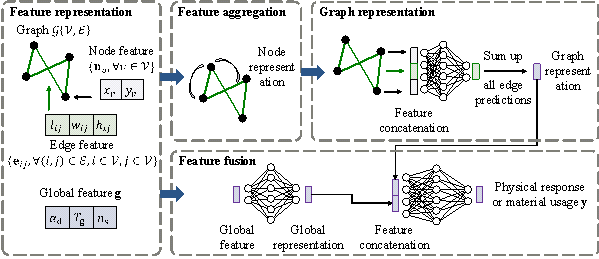 requires two material usage indicators ( 4 GNN-based surrogate modelA generalizable surrogate model for the rapid optimization design of shear-wall structures must meet two key requirements. First, it must be able to comprehensively consider design information, especially the topological relationships between structural components, for accurate fitness evaluation. Second, once trained, it must be applicable to shear-wall structures of any scale, regardless of the number of structural components, so that a high evaluation efficiency can be ensured. Traditional machine learning methods cannot meet these requirements (as detailed discussed in Section 4.3), a GNN is therefore adopted in this study. 4.1 Graph neural networksTo evaluate the physical responses and material usages of shear-wall structures, it's necessary to consider the structural layout (topological information), component sizes (geometric information), and design conditions (textual information) simultaneously. To effectively integrate these heterogeneous input data, a GNN architecture recently proposed by the authors (Fei et al., 2023) , known as Graph-GEN, is used as the surrogate model. This method incorporates feature representation, feature aggregation, graph representation, and feature fusion algorithms specifically designed for tasks related to building structures, as depicted in Figure 8. Compared to traditional machine learning methods, Graph-GEN is a more generalizable surrogate model for the design of shear-wall structures. Figure 8 Architecture of Graph-GEN Table 3 Input and output variables of Graph-GEN