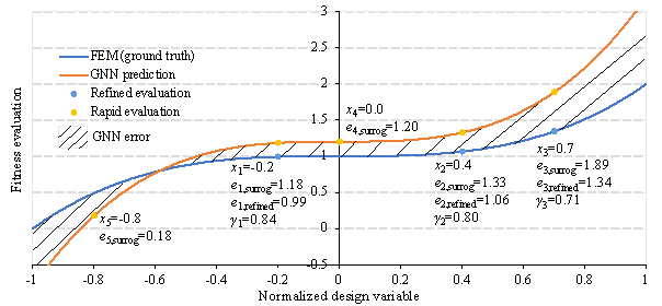 The results indicate that the MAPE of the total objective function is 7.4%, with the PE ranging from -5.2% to 16.9%. The MAPE for individual objective functions ranges from 1.1% to 8.0%, with the corresponding PE ranging from -17.8% to 17.6%. It is concluded that the GNN surrogate models are capable of performing an accurate fitness evaluation of shear-wall structures in most circumstances, but there are substantial errors in a few instances. Therefore, GAEA needs to employ the refined evaluation by the FE model to correct the rapid evaluation by the GNN surrogate models. Within the environment of YJK-GAMA, a single fitness evaluation using the GNN surrogate models takes about 6 s, whereas using the FE model takes approximately 5 min. Hence, the evaluation efficiency of the GNN surrogate models is approximately 50 times that of the FE model. 5 Distance-based surrogate model evaluation and updating5.1 Proposed strategyFor every new design variable vector generated during the optimization process, there are two different ways to conduct a fitness evaluation: (1) Rapid evaluation based on surrogate models: This involves quickly evaluating the design performance using GNN surrogate models, noting that surrogate models are an approximation of detailed numerical simulations and are inevitably prone to errors. (2) Refined evaluation based on FE models: This involves establishing a detailed FE model corresponding to the design variable vector to calculate its performance. The advantages and disadvantages of the refined evaluation are the exact opposite of rapid evaluation. The efficiency of refined evaluation is lower than that of rapid evaluation, but it has higher accuracy. Combining the advantages of the above two methods, SAEA typically carries out both rapid and refined evaluations during the optimization process and uses the results of the refined evaluations to update the surrogate models, keeping the errors of rapid evaluations under control (Y. Jin et al., 2019) . Traditional SAEA uses conventional machine learning methods as surrogate models. The results of refined evaluations are used as new training samples, and the surrogate model can be updated by retraining the machine learning model. Since conventional machine learning methods have limited trainable parameters, their training generally takes only a few minutes or even seconds, making the cost of retraining acceptable. However, the generalizable surrogate model used in this study is based on a deep GNN (see Section 4), which has a large number of trainable parameters and requires hundreds of minutes to train. The cost of retraining the GNN is too high, thus necessitating a new strategy for model updating. A distance-based surrogate model evaluation and updating strategy is proposed herein. The distances are measured between the design variable vectors of different candidate solutions. When the distances between different candidate solutions are small, an identical error correction factor can be used to adjust the predictions of the surrogate model. This avoids calculating the error correction factor for each candidate solution repeatedly, thereby saving computational time. The error correction factor is obtained by comparing the refined calculation results of FE models with the rapid prediction results of GNN. The proposed method is feasible and applicable for optimization problems without high nonlinearity, e.g., shear-wall structural design in the schematic design phase, which requires only linear or equivalent linear analysis. In these circumstances, the following phenomena can be observed: The GNN model used in this study exhibits continuity, which forms the basis for using gradient-based algorithms (e.g., gradient descent) for training. Therefore, minor changes in the input to the model only result in slight variations in the model's predictions, as shown by the orange curve in Figure 9. Meanwhile, the ground truth that the model aims to predict is also continuous. Minor changes in the design information (e.g., the length of a shear wall) only cause small variations in the physical responses and material usage, as depicted by the blue curve in Figure 9. Hence, for minor changes in the model input, the error of the model prediction from the ground truth also varies marginally, as indicated by the shaded area in Figure 9. When the distances between several design variable vectors are small (e.g., x1, x2, and x4 in Figure 9), the errors in their model predictions are relatively similar, and an identical error correction factor can be roughly used to adjust the evaluation results of the surrogate model. Definitions of distance and the error correction factor can be found in Section 5.2. Figure 9 Schematic diagram of distance-based model evaluation and updating Similar to the existing distance-based model updating methods (Branke & Schmidt, 2005) , the proposed method can enhance the exploration of unknown design spaces that have not been visited by the EA (Črepinšek et al., 2013) . However, existing distance-based model updating methods require adding refinedly evaluated design variable vectors to the training samples, followed by retraining of the surrogate model. In contrast, the proposed method does not require the surrogate model to be retrained but directly adjusts the prediction results, featuring a significant difference and advantage to the existing approaches. 5.2 Algorithm implementationFor a given design variable vector to be evaluated, calculate its distance d from the design variable vectors that have already been refinedly evaluated, to determine whether an identical error correction factor can be used. The definition of the distance d is given in Equation (7):