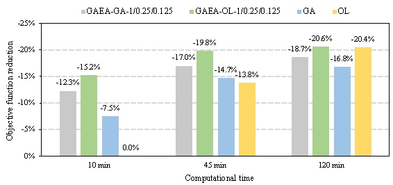 results shown in Table 7, for a 10-min optimization task, Figure 11 Objective function reduction for given identical computational time Figure 11 shows the average reduction in the total objective function after being optimized by various algorithm configurations when the same computational time is consumed. It can be observed that the optimization outcome using OL as the supporting algorithm is superior to that when using GA. This is because OL itself constructs machine-learning surrogate models, which can search the design space more effectively. Therefore, it is recommended to use OL as the supporting algorithm of GAEA, and the following sections will compare the results of GAEA-OL with GA and OL. Specifically: (1) When the available optimization time is 10 min, GAEA-OL-1 (-15.2%) > GAEA-GA-1 (-12.3%) > GA (-7.5%) >> OL (0.0%). This is because, within 10 min, GAEA can complete around 100 fitness evaluations through GNN. In contrast, GA can only perform several evaluations using FE models. OL, which needs to build a dataset, is yet to complete the training of the surrogate models within the 10-min time slot, and its optimization will not start. The total objective function reduction achieved by GAEA-OL-1 is significantly higher than the traditional methods, being 2.03 times that of GA. (2) When the available time is 45 min, GAEA-OL-0.25 (-19.8%) > GAEA-GA-0.25 (-17.0%) > GA (-14.7%) > OL (-13.8%). At this point, OL has completed the training of the surrogate models, which significantly improves the efficiency of fitness evaluation, and its optimization outcome gradually approaches that of GA. Nevertheless, GAEA still maintains a leading advantage over GA and OL. The total objective function reduction achieved by GAEA-OL-0.25 is significantly higher than the traditional methods, being 1.43 times that of OL and 1.35 times that of GA. (3) When the available time is 120 min, GAEA-OL-0.125 (-20.6%) > OL (-20.4%) > GAEA-GA-0.125 (-18.7%) > GA (-16.8%). This is because, as training samples related to this specific structure case are accumulated, the traditional case-specific surrogate model gradually approaches the generalizable GNN surrogate model in terms of evaluation accuracy. The total objective function reduction achieved by GAEA-OL-0.125 is slightly higher than the traditional SAEA, being 1.01 times that of OL. It is still significantly higher than the traditional EA, being 1.23 times that of GA. Additionally, paired sample t-tests are conducted to evaluate the statistical significance of the mean reduction in the objective function by GAEA optimization compared to those by GA or OL. The null hypothesis states that the mean reduction in the objective function by GAEA optimization is less than that by GA or OL. The p-values for comparing GAEA-OL with GA and OL are presented in Table 8, and the significance level 汐 is set as 0.1. A p-value lower than 汐 leads to the rejection of the null hypothesis, suggesting that the mean reduction in the objective function by GAEA optimization is statistically not less than that by GA or OL. When comparing GAEA-OL-0.125 with OL, the null hypothesis cannot be rejected, indicating that GAEA-OL-0.125 is not significantly superior to OL. In other circumstances, the null hypothesis is rejected, affirming that the effectiveness of GAEA is statistically significant. Table 8 P-values of the t-tests