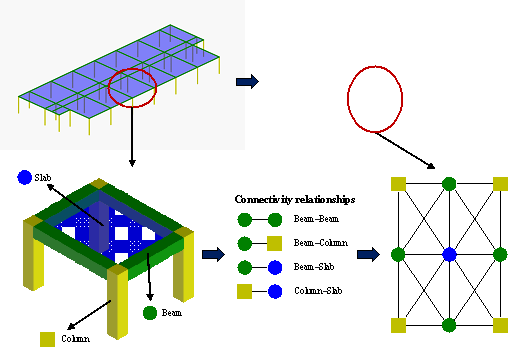 (c) Size distribution of slabs Figure 2. Statistical size distribution of beams, columns, and slabs. The statistical data reveal that the widths of beams are mainly between 200 and 300 mm, while the heights range primarily from 400 to 800 mm, often in multiples of 100 mm. The cross-sections of columns are typically square, with lengths in both the x and y directions primarily distributed between 400 and 700 mm. In some cases, the length in the y direction exceeds that in the x direction. Slab thicknesses are generally concentrated around two values: 100 and 120 mm. To compare the effectiveness of different models, the dataset was divided into training, validation, and test sets in a 6:2:2 ratio. The training, validation, and test sets consist of 57, 19, and 19 buildings, respectively. However, the dataset still has some limitations. The data volume is relatively limited and needs further expansion. Additionally, it does not yet consider architectural design requirements, such as clear height, which can be further supplemented and refined in future work. 2.4 Graph representation To use HetGNNs for prediction, the CAD drawings in the dataset must first be converted into heterogeneous graphs, as shown in Figure 3. A comprehensive description of all the processing steps can be found in Appendix A. Based on spatial relationships, the links between nodes representing beams, columns, and slabs are categorized into four types: beam每beam, beam每column, beam每slab, and column每slab. A beam每beam link is created between two beam nodes when they are either connected to the same column or directly interconnected. A beam每column link forms between a beam node and its connected column node. Links between slab nodes and surrounding beam and column nodes are categorized as beam每slab and column每slab, respectively. Figure 3. Representation method for heterogeneous graphs of RC frame structures. Based on the data presented in Table 1, to predict beam width, beam height, column section length in the x and y directions, and slab thickness, various features can be assigned to the beam, column, and slab nodes, as outlined in Table 2. These features fall into four categories: (1)