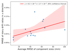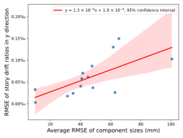 of story drift ratios. For the Based on the cases in this section, further exploration of the relationship between the average RMSE of component sizes and the RMSE of story drift ratios in the x and y directions was conducted using linear regression analysis. The results are presented in Figure 9.