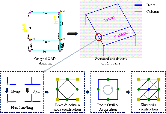 1 Introduction Reinforced concrete (RC) frames, commonly used to resist vertical and horizontal loads, have traditionally been designed through extensive engineering experience and iterative verification processes involving labor-intensive calculations and analyses. This conventional approach, while robust, tends to be time-consuming and highly dependent on engineering expertise. Recent advancements in artificial intelligence (AI) offer transformative opportunities for civil engineering [1每3] , harnessing existing data to learn from past designs and efficiently determine optimal structural dimensions that meet specifications. Therefore, this study aims to efficiently and accurately achieve component size design for RC frame structures. The intelligent design of RC frame sections primarily employs two approaches: optimization and generative AI designs. Optimization design aims to refine component sizes based on inherently slow evaluation of mechanical performance and material consumption [4] . In contrast, generative AI design learns from existing drawings, identifies design patterns, and quickly determines appropriate section sizes [5] . (1) Existing studies have explored optimization techniques, initially using gradient [6,7] or Lagrange multipliers [8,9] approaches and later incorporating heuristic algorithms such as evolutionary algorithms [10,11] , particle swarm optimization [12,13] , and harmony search [14] . These methods, which involve evaluating the structural performance under seismic and gravity loads [15每17] , are precise but often inefficient, potentially taking hours. Recent developments have integrated neural networks with surrogate models to accelerate the optimization process [18] , though still time-consuming, taking 2 to 4 minutes, and prone to localized design flaws due to fictional structural design datasets, making it challenging to learn fundamental project design rules. Since engineers often desire WYSIWYG (what you see is what you get) and real-time design feedback, some researchers have proposed generative AI design methods. (2) Generative AI design simplifies the process by eliminating the complex optimization stages inherent in traditional optimization-based methods. By learning from existing designs, AI can consistently perform design tasks, minimizing biases associated with subjective optimization constraints and objective functions. However, to achieve the design of RC frame structures, a high-quality dataset that includes design conditions, structural layout, and component sizes from real-world engineering cases is needed. Currently, there is a lack of such datasets. Chang et al. [19] constructed a virtual dataset for RC frame structures through random sampling and optimization. They used graph neural networks (GNNs) to predict sizes, demonstrating the feasibility of generative AI. However, due to the fictitious nature of the data, this method still exhibits significant discrepancies from actual engineering design results, not fully aligning with real design experience. Despite the challenges of the limited availability of high-quality datasets of RC frames, successful applications in many other structures have showcased the potential of generative AI design. For instance, Liao et al. [20] developed an intelligent design method for shear wall structure layouts using generative adversarial networks (GANs). This was followed by enhancement through embedding domain knowledge [21] , physical rules [22] , and attention mechanisms [23] . Building on these foundations, Fei et al. [24] proposed a method for the component sizes of core tube frame structures, while Feng et al. [25] applied the approach to the component sizes of shear wall structures. Nevertheless, all these methods are based on pixel-based images and have the following limitations: (a) It treats the structural plan as a whole input, focusing more on the overall structure information and making it difficult to consider the relationships between different components. In the size design of RC frame structures, the sizes of components are determined not only by global information but also closely related to the surrounding components. (b) The pixel-based method can only input two-dimensional plans and is unable to account for vertical connections between components. (c) Since slabs occupy a large proportion of the structural plan, the pixel-based method tends to overemphasize the role of slabs while neglecting the design of beams and columns. (d) Each pixel in the pixel-based method is unstructured, making it challenging to reflect the topology of beams, columns, and slabs based on the information within the pixels. Considering the complex nature of frame topologies, it is logical to employ GNNs and develop graph-based representations of frame structures. Existing studies have adopted graph-based approaches. For example, HouseGAN and HouseGAN++ used graph nodes to represent rooms within a building [26,27] and predict architectural layouts. Chang et al. [19] represented beams and columns in RC frame structures as nodes with identical feature dimensions, differentiating them by a unique characteristic. Zhao et al. [28] employed GNNs to predict the arrangement of beams between columns in frame structures, comparing three graph representation methods: nodes representing beams, nodes representing columns, and nodes representing both beams and columns. Zhang et al. [29] utilized a structure topology-generative adversarial network (StrucTopo-GAN) to generate layouts for complex structures, with nodes representing intersections and columns and edges representing beams and walls. Zhang et al. [18] represented component intersections as nodes and beams and columns as edges but required the same dimensions of connected beams and columns when optimizing beam sizes. These studies suggest that using nodes and edges to represent components within frame structures is feasible. However, if slabs are further introduc