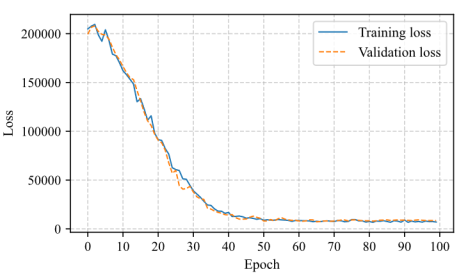 A.3 Room outline acquisition After constructing the beam and column nodes, a traversal algorithm can be used to obtain the room outlines, thereby determining the slab boundaries. The specific implementation is summarized as follows: traverse the beam nodes counterclockwise to find loops. Identify the beam node with the smallest counterclockwise angle relative to the current beam node among adjacent beam nodes and add it to the room component list. If a column node exists between two adjacent beam nodes, it is also added to the component list. Repeat the above steps until the initial beam node is reached, completing the room outline identification. Repeat this process to find all room outlines. The detailed method is illustrated in Figure A.2. Figure A.2 Traverse counterclockwise to find loops in order to obtain room outlines. A.4 Slab node construction After obtaining the room outlines, slab boundary polygons can be established. In CAD drawings, slab attributes are represented by single-line text. By using the ray casting algorithm [48] , it is possible to determine whether the reference point of the single-line text lies within the room contour polygon, thereby obtaining attributes such as room type, load, and slab thickness. This enables the construction of slab nodes. Subsequently, the connections between slab nodes and other nodes can be established based on the component list corresponding to the slab. Appendix B To mitigate the risk of overfitting, standard training strategies were implemented. The dataset was rigorously divided into training, validation, and test sets to prevent data leakage. Training was conducted on the training set, the model demonstrating the best performance on the validation set were selected to minimize overfitting. Finally, the model was evaluated on the test set. The model uses the MSE loss function to assess the discrepancy between predicted and actual values, as shown in Eqaution B.1 where Taking the optimal model identified in Section 3.2.4 as an example, its training process is illustrated in Figure B.1 Figure B.1 Training and validation loss of the optimal model. At the 55-th epoch, the validation loss reached its minimum, with an MSE loss value of 8009.81. Therefore, the model at this point was selected as the optimal model for subsequent testing to prevent overfitting. To further evaluate whether the
